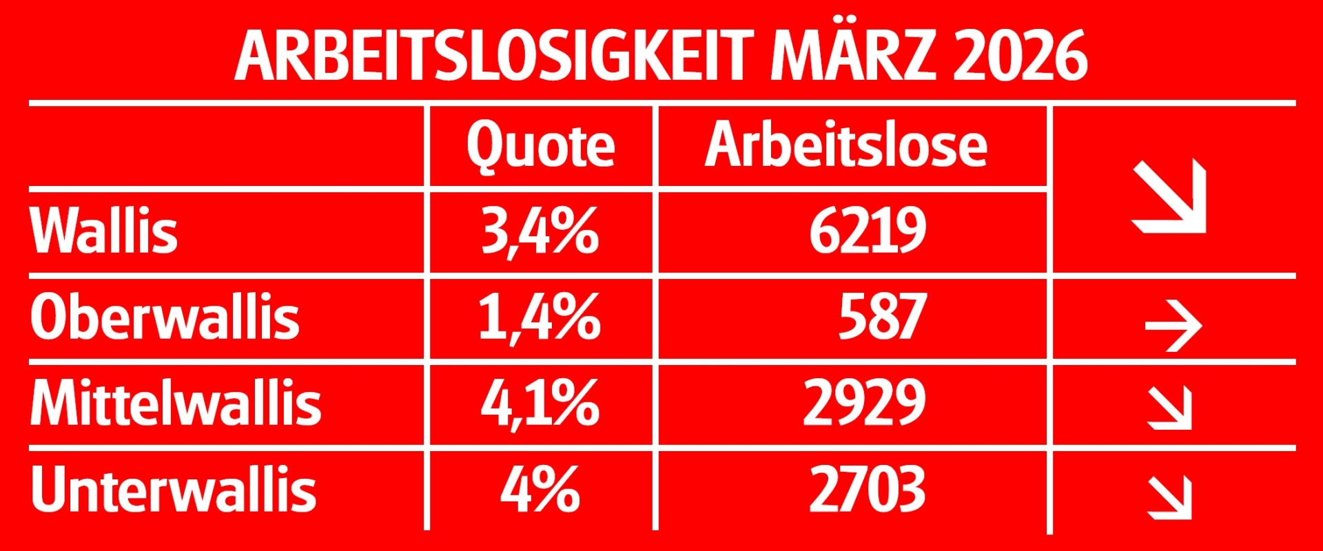 Ende März waren in den Regionalen Arbeitsvermittlungszentren (RAV) des Wallis 6’219 Arbeitslose gemeldet. Im Vergleich zum Vormonat sind dies 643 weniger. Die Arbeitslosenquote sank im Wallis um 0,4 Prozentpunkte auf 3,4 Prozent.