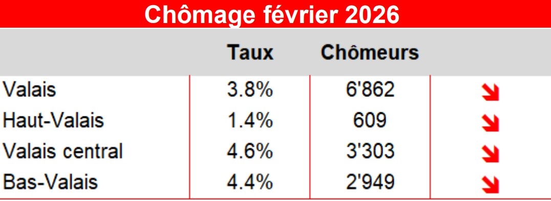 À la fin février, 6'862 chômeurs étaient inscrits auprès des Offices régionaux de placement (ORP) valaisans, soit 572 de moins que le mois précédent. Le taux de chômage en Valais a diminué à 3,8% (-0,3 pp), soit la plus forte baisse parmi tous les cantons suisses.