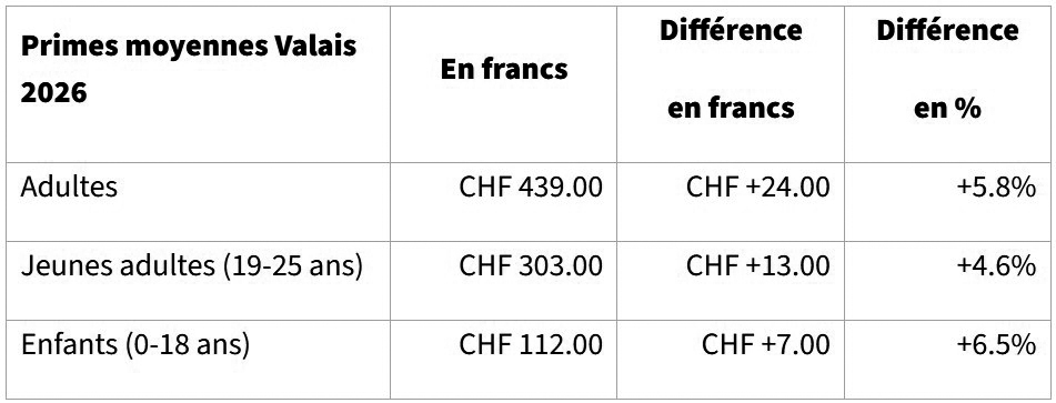 En 2026, les primes d’assurance-maladie connaîtront de nouveau une hausse conséquente en Valais. La prime moyenne valaisanne (tous modèles d’assurance, franchises et catégories d’âge confondus) augmentera de 21 francs par mois ce qui équivaut à une croissance de 5,9%. En moyenne suisse, la hausse annoncée est de 17 francs par mois, soit une augmentation de 4,4%. Malgré les efforts importants faits dans le canton pour contenir les coûts (moratoire sur l’installation de nouveaux médecins, planification de l’offre en soins hospitaliers et de longue durée, régulation des équipements médico-techniques lourds), les primes continuent d’augmenter de manière importante, mettant en évidence la complexité du pilotage du système de santé. L’augmentation valaisanne s’explique en partie par une population plus âgée que celle des autres cantons. À noter que les primes valaisannes restent les plus basses de Suisse romande. Les assurés peuvent souvent faire des économies sur les primes en changeant de modèle d’assurance, de franchise ou de caisse-maladie. Le Département de la santé, des affaires sociales et de la culture encourage donc les assurés à comparer les primes. Par ailleurs, pour soulager les assurés de condition économique modeste, un montant de 275,3 millions de francs est prévu au budget 2026 de l’Etat du Valais.